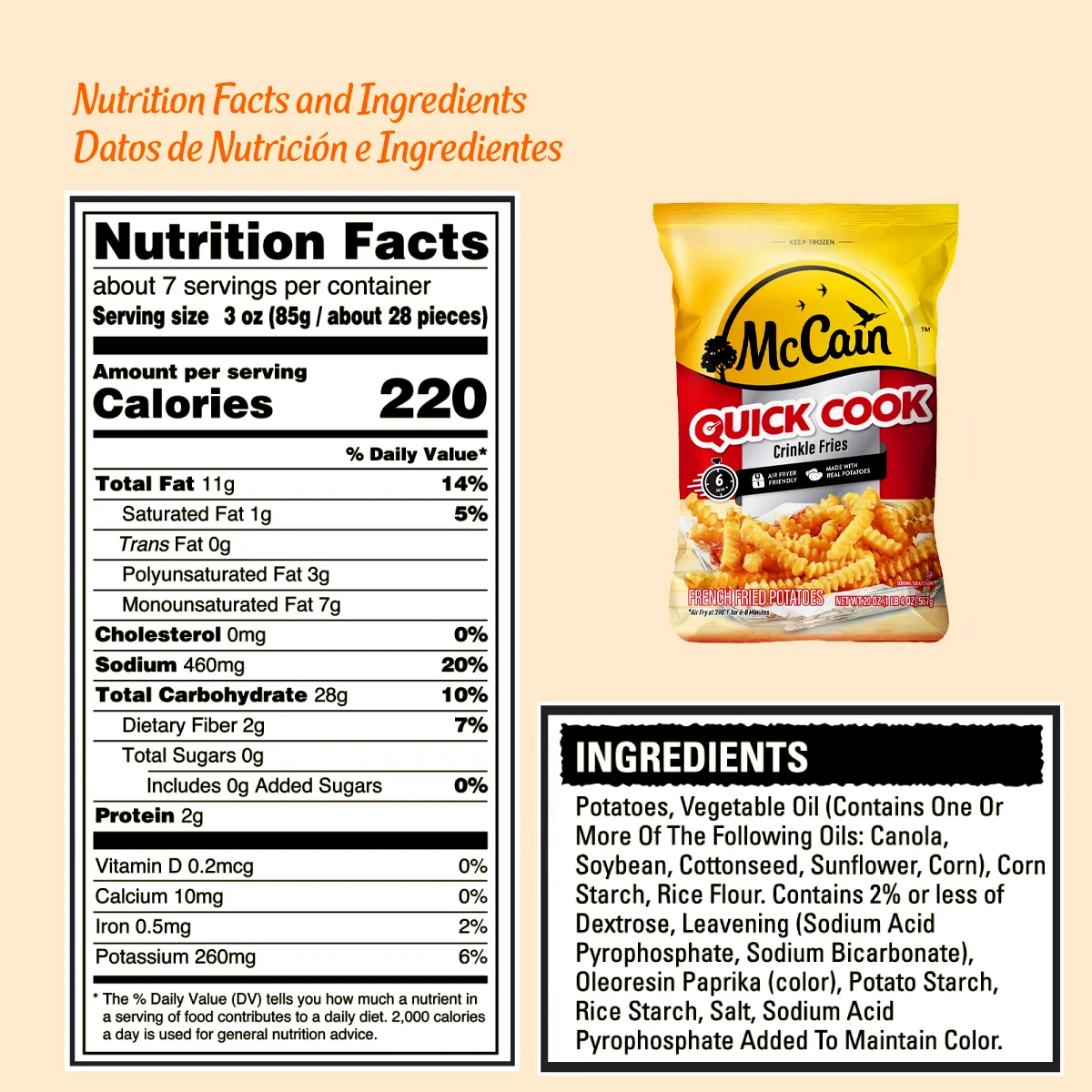 Tus papas favoritas listas en menos tiempo. Papas corte ondulado super crujientes, listas en minutos. Ideales para Horno o Air Fryer